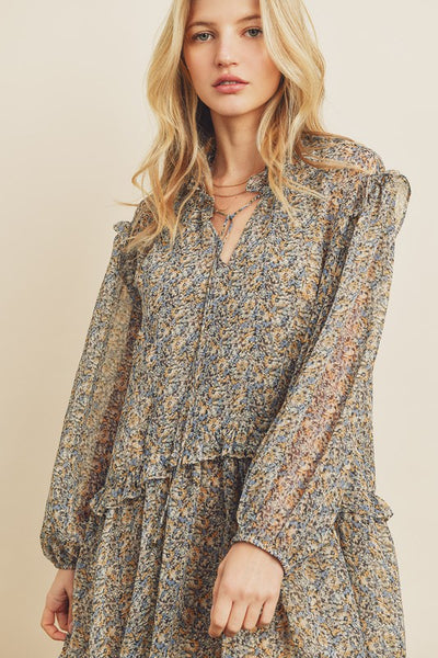 Semi-sheer, floral print mini dress featuring ruffled trim detail at neckline, shoulder, and waist. Drawstring tie detail at neckline. Partially lined. Model is 5'6" and wearing size Small.